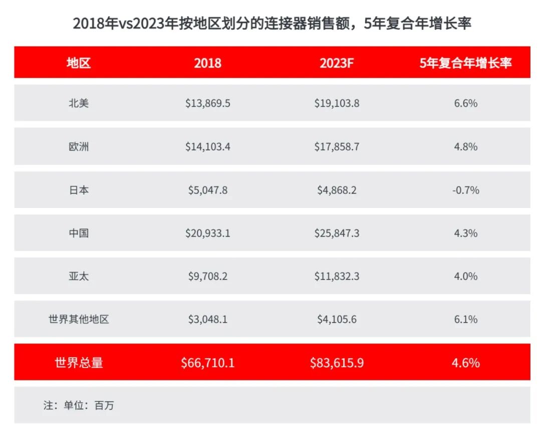 2018年与2023F年按地区划分的中国连接器销售额