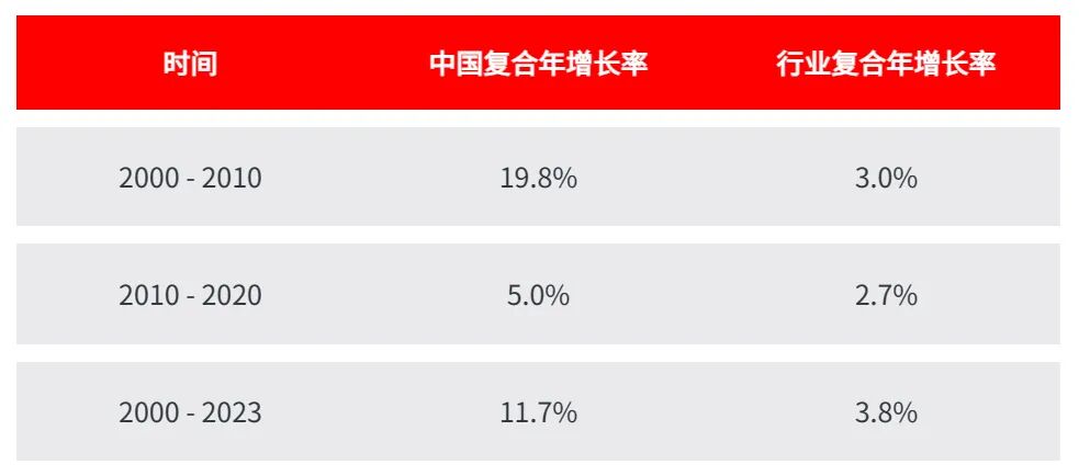 在接下来的十年里,即2010年至2020年,中国的销售额增长仍优于其他地区,但增速放缓幅度很大。中国的复合年增长率从19.8%上升到5.0%。