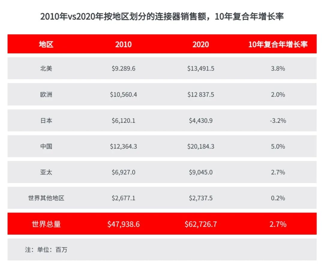 2000年至2010年期间,中国实现了19.8%的增长率,而行业增长率为3.0%。这与其他地区的负增长率或低增长率形成了鲜明对比。显然,中国是连接器行业销售增长的源头。