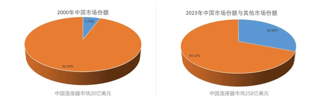 自2000年以来,中国一直是连接器行业和整个电子行业的增长引擎。如前所述,2000年,中国仅占全球连接器市场的5.7%。到2023年,中国占全球连接器市场的30.9%。