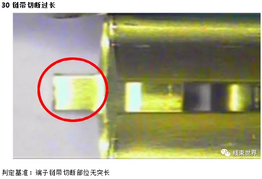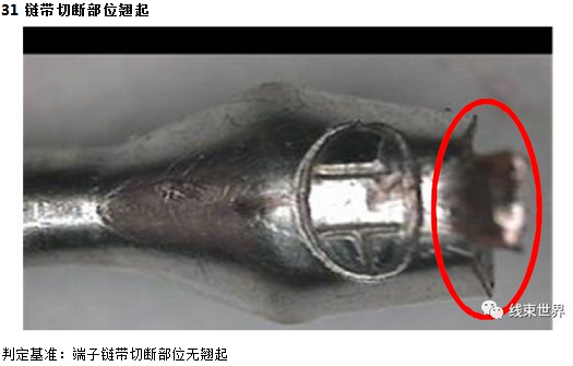 二、绝缘层压着部位:线皮包容良好,外观无受损,变形;端子链带切断部位最长不超过③0.5㎜,且无翘起.
