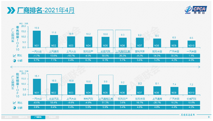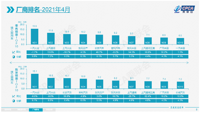从乘联会公布的厂商销量数据来看,由于去年疫情影响销量导致基数较低,国内多家车企在4月份仍然实现较强的增长,但是国内前十车企排名也有所调整,榜单中一汽-大众、上汽大众和吉利汽车销量均出现下滑。