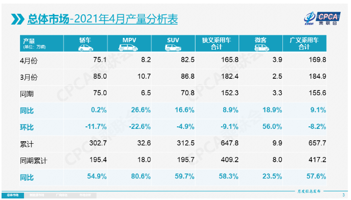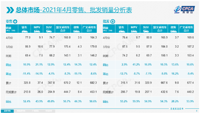5月11日,乘联会发布最新报告显示,2021年4月国内狭义乘用车零售量为160.8万辆,同比2020年4月增长12.4%,同比2019年4月增长6.5%,环比2021年3月下降8.3%。1-4月狭义乘用车零售累计670.2万辆,同比增长50.7%,超高的涨幅主要是2020年1-4月的全国乘用车市场累计零售下滑32.7%的低基数效应。